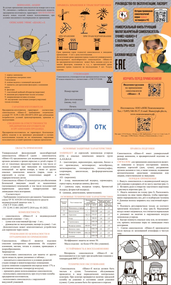 Универсальный фильтрующий самоспасатель (УФМС) «Шанс»-Е с полумаской (базовая модель) предназначен для индивидуальной защиты органов дыхания и зрения людей от токсичных продуктов горения, включая монооксид углерода (CO), при эвакуации из задымленных помещений во время пожара. Также обеспечивает защиту от других опасных химических веществ (паров, газов, аэрозолей) при техногенных авариях и террористических актах.